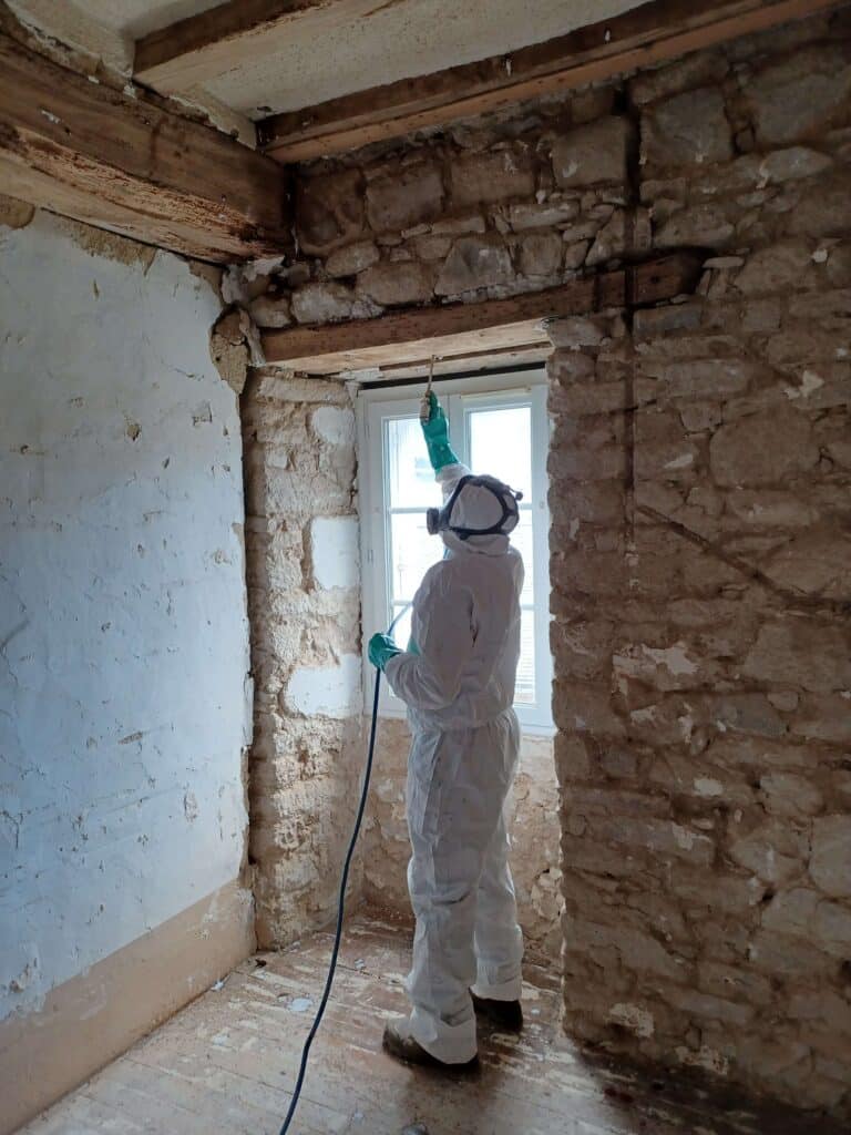 Pour les termites, le traitement curatif implique également un traitement des murs et des fondations pour éliminer les galeries souterraines par lesquelles les termites remontent vers le bois.